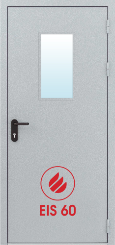 Двери металлические противопожарные EIS 60 дымогазонепроницаемые однопольные со светопрозрачным заполнением типа ДМПд-01-60-О. Соответствуют требованиям технического регламента.